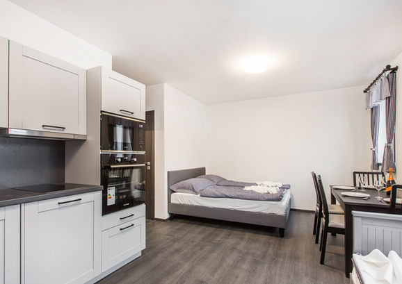 Studio Daniel - č. 9 se nachází v přízemí s výhledem do areálu a okolních lesů. Jedná se o Studio až pro 4 osoby. Ve Studiu se nachází manželská postel a přistýlka (rozkládací postel), kterou je možné rozložit pro 2 osoby. Studio je nadstandardně vybaveno a zrekonstruováno - najdete zde plně vybavenou kuchyni s lednicí, troubou, mikrovlnnou troubou, varnou indukční deskou, kávovarem a rychlovarnou konvicí. V koupelně se nachází toaleta a velký sprchový kout.